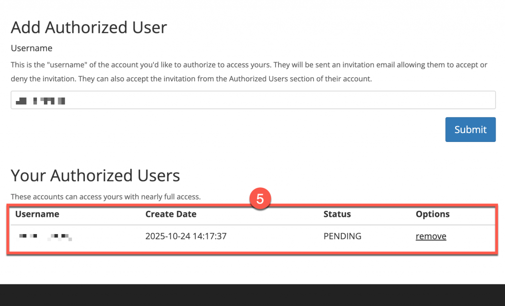 Unless Porkbun shows you an error, you’ve finished! They’ve sent an email to the user you specified, and you can even scroll down a little to the (5) Your Authorized Users section see the status of who has access to your account:
